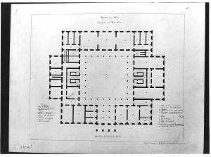Progetto per Borsa a china e acquerello azzurro su fondo chiaro entro linea di margine a china. Pianta del piano terreno di edificio quadrangolare con ingresso centrale preceduto da portico e grande cortile interno porticato. Le sale e i servizi sono collocati lungo il perimetro. A sinistra: avancorpo con sale e vani adibiti a servizio. A destra: avancorpo con sale adibite all'esposizione dei prodotti commerciali e magazzino. Al centro due scaloni con accesso dal cortile. In basso a destra e sinistra, legenda con numeri di riferimento.