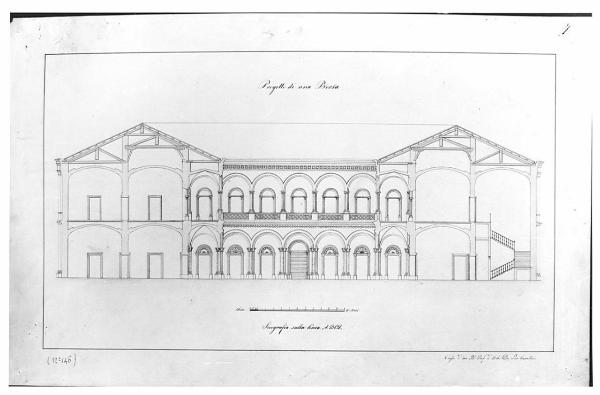 Progetto per Borsa a china, acquerello rosa, azzurro e marroncino su fondo chiaro entro linea di margine a china. Sezione sulla linea A.B.C.D. di edificio quadrangolare. A sinistra sezione di corpo di fabbrica a due pieni con coperture interne a volta ribassata e copertura a capriate. Al centro veduta del prospetto del cortile interno con aperture modanate. In alto: balaustra decorata a motivi geometrici e corrispondenti aperture ad arco. Cornicione terminale decorato. A destra: corpo di fabbrica con vista dello scalone a copertura a capriate.