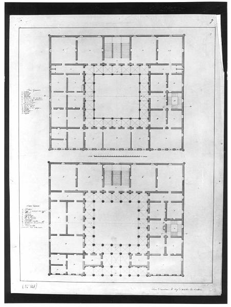 Progetto per Borsa a china e bistro su fondo chiaro entro linea di margine a china. In basso: pianta del piano terreno di edificio quadrato con ingresso centrale e corte interna porticata. Lungo il perimetro vani servizio, esposizione e abitazione per il custode. Scalone a due rampe e scala di servizio a destra. In alto: pianta del primo piano della Borsa con stanza per il Telegrafo, la direzione e l'Archivio. Lungo il margine sinistro, in alto e in basso, legenda con numeri di riferimento.