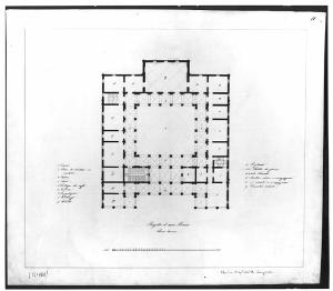 Progetto per Borsa a china su fondo chiaro, entro linea di margine a china. Pianta del piano terreno di edificio quadrangolare con due avancorpi laterali sulla facciata e portico centrale. Corte interna quadrangolare porticata, avancorpo rettangolare lungo la facciata posteriore. Serie di vani lungo il perimetro e tre scaloni d'accesso al piano superiore. Al centro, a destra e a sinistra, legenda con numeri di riferimento.