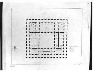 Progetto per Borsa a china su fondo chiaro, entro linea di margine a china. Pianta quadrangolare di edificio con corte centrale quadrata, ampio salone con copertura a volta e abitazioni dei custodi, due scaloni d'accesso ai piani superiori. I vani di servizio sono collocati lungo il perimetro dell'edificio. Il corpo di fabbrica è compreso in un camminamento esterno.