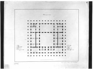 Progetto per Borsa a china su fondo chiaro, entro linea di margine a china. Pianta del primo piano di edificio quadrangolare con corte centrale e grande salone rettangolare posteriore. Serie di vani lungo il perimetro, due scaloni a doppia rampa e camminamento interno delimitato da plinti quadrangolari e esterni e coperture a cupole contigue. In basso, a destra e a sinistra, legenda con numeri di riferimento.