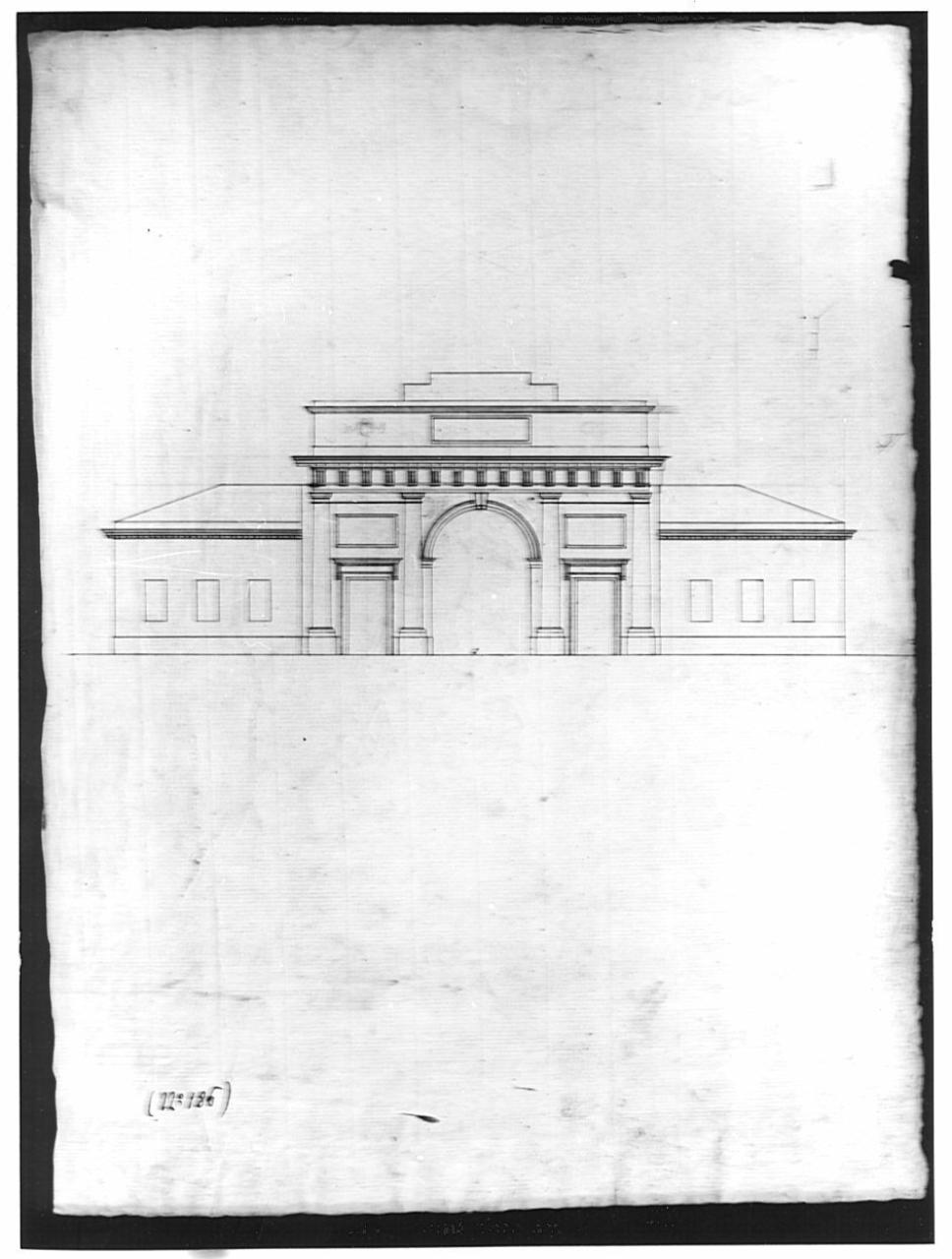 Alzato di porta urbana a china su fondo chiaro con tracce di matita. Prospetto con arco trionfale ad unico fornice centrale e due corpi di fabbrica con copertura a spiovente terminante al livello del fregio dell'arco. L'arco presenta sulla facciata quattro colonne su pidistallo lisce con capitello dorico e due aperture con modanature, architrave e mensole. Arco centrale con chiave di volta. Superiormente un fregio dorico precede un attico con tabula centrale.