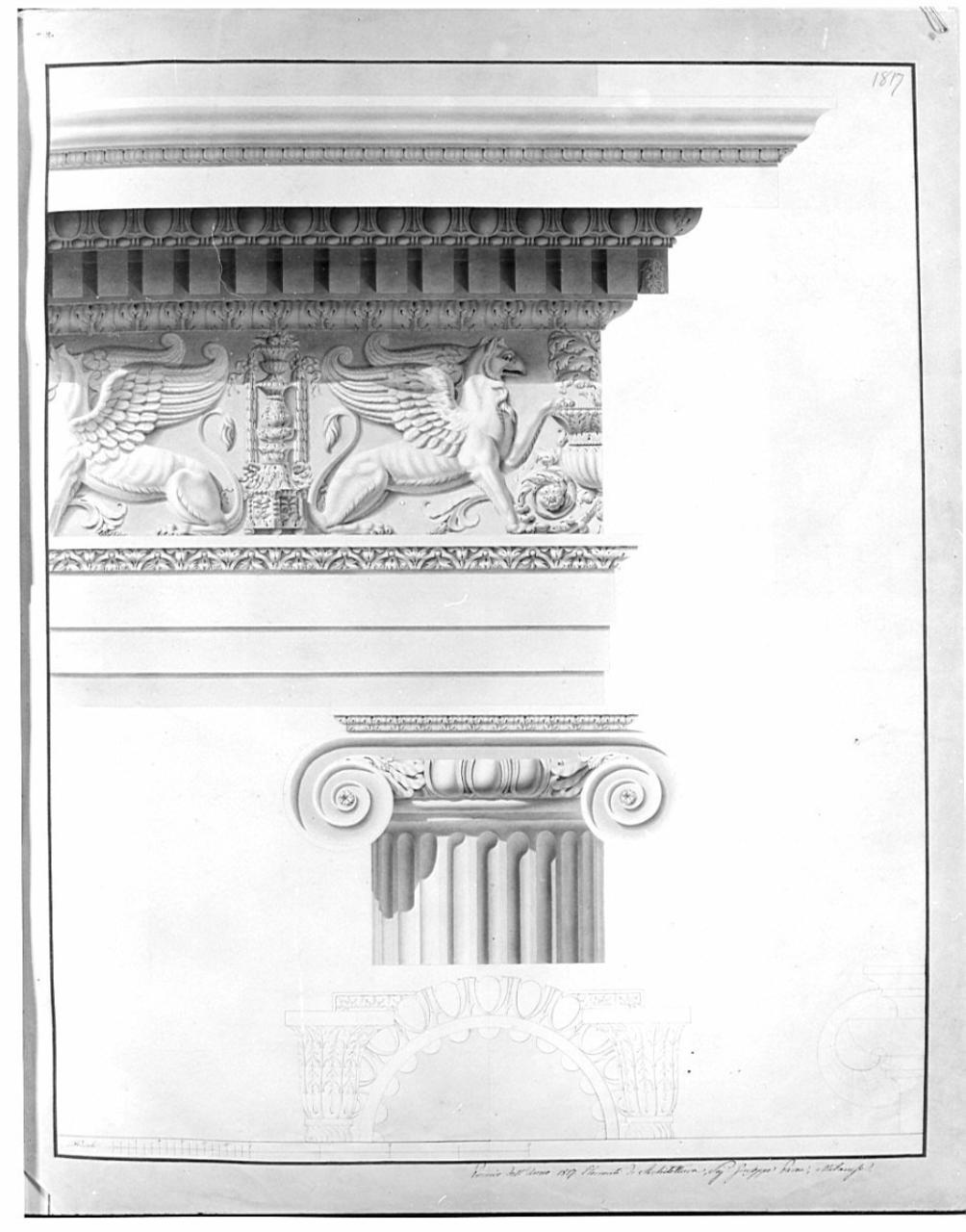 - NOTIZIE STORICO CRITICHE Il disegno fu premiato nel 1817 al concorso di seconda classe per gli ordini architettonici (Scuola di Architettura) dell'Accademia di Belle Arti di Brera (Atti dell'I.R. Accademia delle Belle Arti di Milano, Milano 1817, p. 40). La tavola è conservata nella cartella MI 90, insieme ad altri 25 disegni premiati nella stessa scuola negli anni tra il 1813 e il 1832.