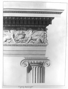 Prospetto ombreggiato di trabeazione su capitello ionico a china nera e bistro su fondo chiaro entro marginatura a china. Vista di parte del fusto della colonna ionica con scanalature a pianetto, cimasa del fusto con listello e astragalo. Echino con ovoli e frecce e baccelletti all'incontro con le volute, due con rosette nell'occhio, Abaco con foglie di tribolo d'acqua. Architrave tripartito a fasce. Superiorm.: separato da un listello e da una gola rovescia con archetti e bocciuoli, fregio continuo zooforo con grifi e vasi, girali fitomorfi e candelabri d'angolo sormontato da cimasa, cornice a dentelli, sottocornice ad ovoli, corona, cimasa e sima.
