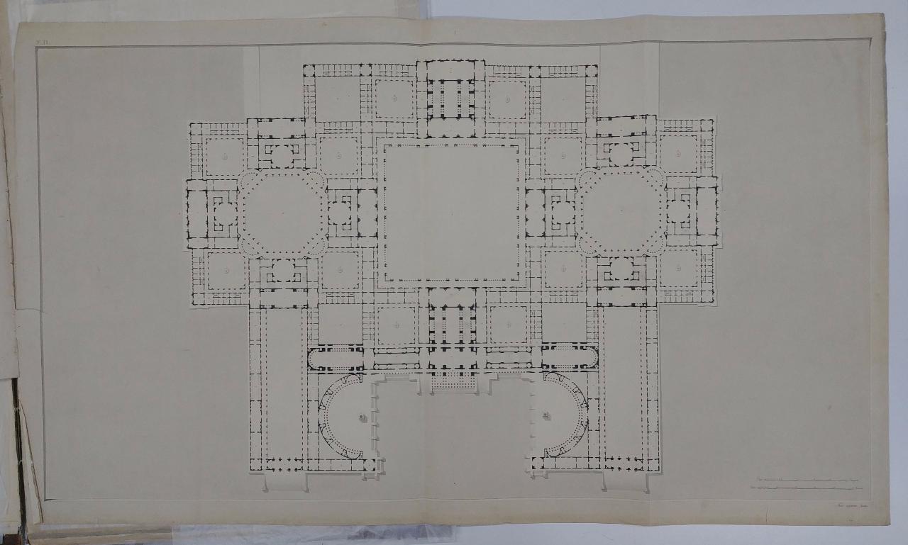 Un Palazzo Reale per una Città in pianura proporzionato alla dignità e al regolare servizio di una corte cospicua, ed all'alloggio contemporaneo di più d'una Testa Coronata. Lo stile dell'architettura sarà dei migliori tempi Greci e Romani. architettura: palazzo reale (planimetria generale del piano nobile)