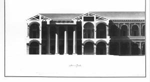 La tavola contiene la sezione longitudinale dell'ingresso principale: un vestibolo immette in un atrio rettangolare a doppia altezza contraddistinto da un ordine gigante di colonne doriche. Di qui si passa ad un vestibolo che disimpegna le due scalinate frontalmente simmetriche che conducono al piano superiore.