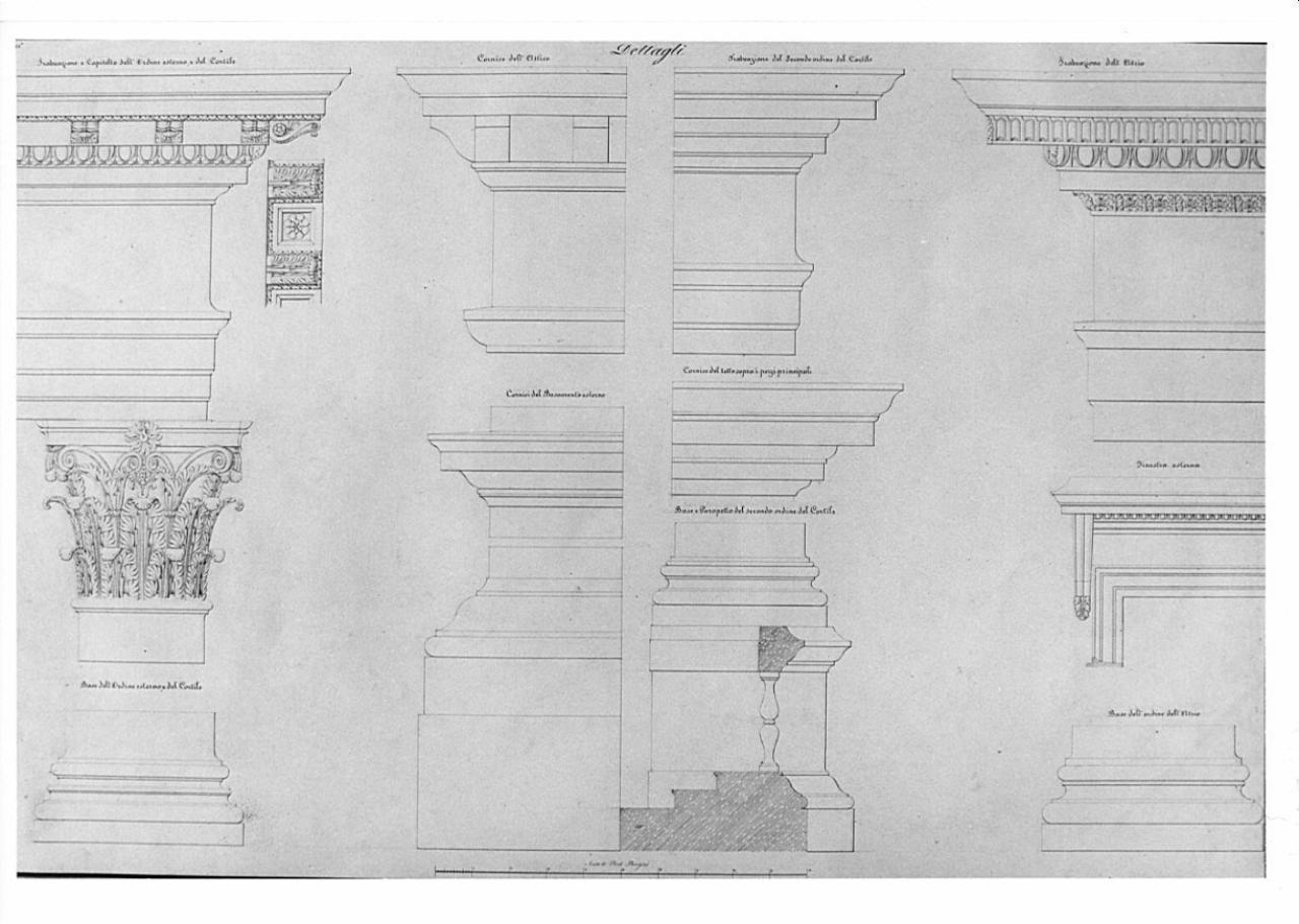 12 particolari esterni di colonne, capitelli e trabeazioni a china e tratteggio rosa su fondo chiaro, entro linea di margine a china. Alzati delle basi delle colonne del cortile e dell'atrio; sezione del parapetto del secondo piano del cortile; dettagli della trabeazione e della finestra esterna.