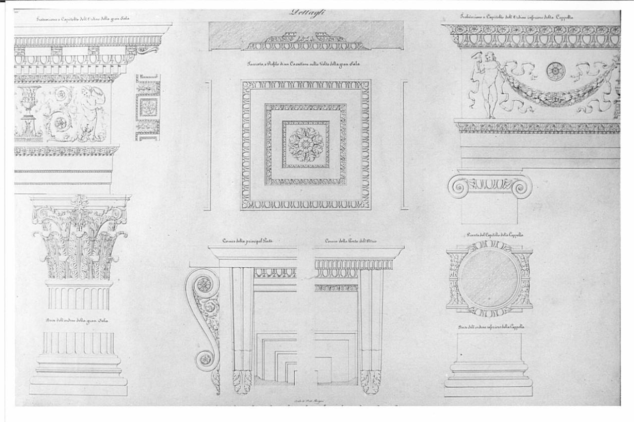 Serie di dieci particolari di decorazione interna della grande sala e della cappella a china e tratteggio rosa su fondo chiaro, entro linea di margine a china. A sinistra: base, capitello e trabeazione corinzia con veduta dal basso del soffitto dell'architrave. Al centro: particolari delle cornici della porta principale e dell'atrio; veduta dal basso e sezione trasversale di un lacunare. A destra: alzato della base e sezione della colonna con capitello ionico; particolare.