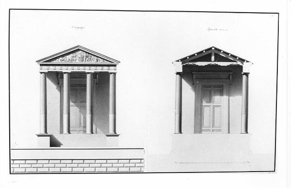 Prospetto e spaccato del Tempio di Ercole a Cora, a china, bistro e acquerello rosa su fondo chiaro, entro linea di margine a china. Sinistra: prospetto del tempio con veduta del muro di sostegno dell'aia e del parapetto; superiormente quattro colonne doriche sorreggono un architrave con metope e triglifi e timpano inciso. Destra: sezione trasversale sulla linea AB con veduta delle colonne del pronao, della porta della cella, dei lacunari e delle capriate del tetto.