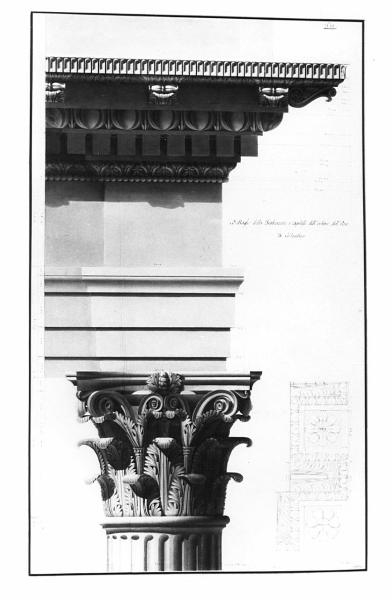 Rilievo di particolari della trabeazione e capitello dell'Arco di Costantino, a china e bistro, quotati, su fondo chiaro, entro linea di margine a china. Alzato del capitello e della relativa trabeazione con veduta dell'architrave, del fregio e della cornice. Sezione orizzontale del soffitto dell'architrave con veduta dei modiglioni e dei rosoni.