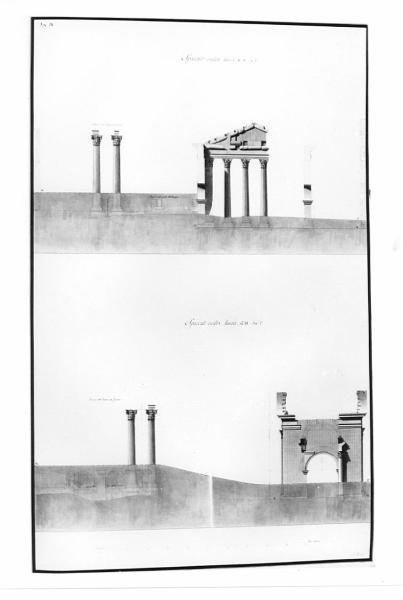 Serie di tre sezioni del portico di Ottavia, a china, bistro e acquerello nero e rosato, quotate a china rossa, su fondo chiaro, entro linea di margine a china. In alto: spaccato sulla linea di sezione EF, tav. I con veduta di parte dell'ingresso e delle due colonne del Tempio di Giunone. In basso: alzato del fianco dell'edificio di ingresso del portico con veduta delle due colonne del pronao del Tempio di Giunone. Sono evidenziate, con le linee di quota RS (attuale) e ZQ (antico), i diversi livelli del terreno.