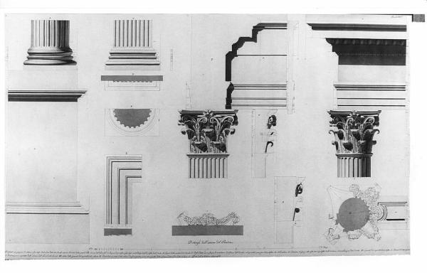 Alzati, piante e sezioni delle decorazioni interne del Pantheon a china, bistro e acquerello rosa, su fondo chiaro, quotati, entro linea di margine a china e bordo azzurro. Alzato del piedistallo e porzione di colonna delle edicole interne, prospetto e sezione di porzione dello stipite della nicchia; alzato e sezione del pilastro. Sezione a due livelli del capitello delle colonne delle edicole. Prospetto e sezione dell'architrave dell'edicola e spaccato del capitello del pilastro. Sezione oirzzontale a più livelli del capitello delle colonne e alzato della relativa trabeazione. Indice e lettere di riferimento in basso al centro.