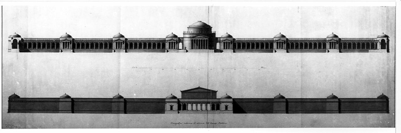 Un Campo Santo quadrato rinchiuso da portici atti a collocarvi interamente in giro memorie e monumenti d'illustri defunti. architettura: campo santo (prospetto)
