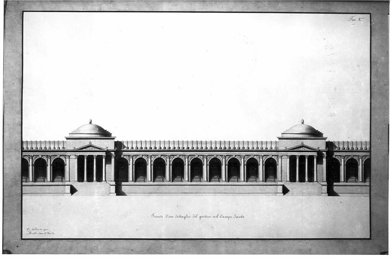 Prospetto di un particolare dei portici d'ingresso all'interno del Campo Santo. Il fronte mostra due atri ai portici preceduti da scalinata con piano tetrastilo, timpano e frontone. Gli atri sono coperti da cupola ribassata. Il disegno mostra, inoltre, parte dei portici ad archi separati da colonne corinzie e coperti da volta a botte.