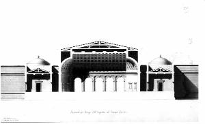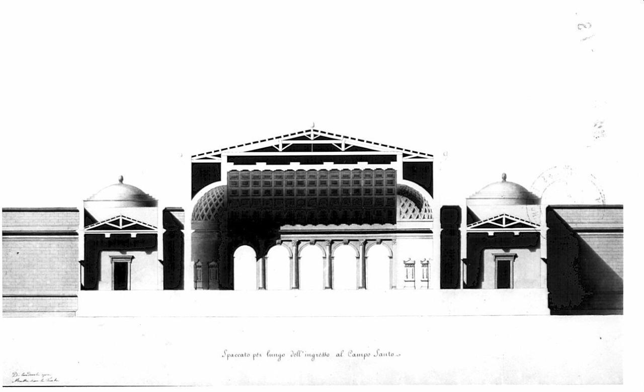 Un Campo Santo quadrato rinchiuso da portici atti a collocarvi interamente in giro memorie e monumenti d'illustri defunti. architettura: campo santo (sezione dell'ingresso)