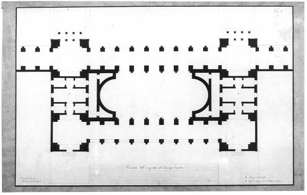 Un Campo Santo quadrato rinchiuso da portici atti a collocarvi interamente in giro memorie e monumenti d'illustri defunti. architettura: campo santo (pianta dell'ingresso)