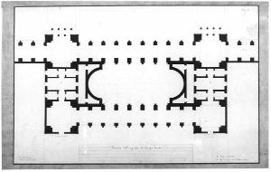 Pianta del corpo d'ingresso al Campo Santo. L'ingresso è porticato e preceduto da gradina te. L'atrio è di forma rettangolare con absidi semi circolari; lateralmente sono poste: da un lato l'abitazione del custode e, dall'altro un locale di servizio. Posteriormente, l'ingresso all'interno del Campo Santo con portico e gradinata.