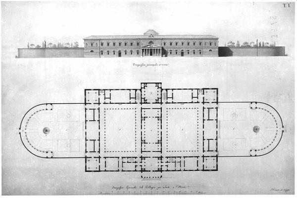 Edificio per convitto e ammaestramento di sordi e di muti per una città capitale. architettura: Edificio per sordi e muti per una città capitale (pianta e prospetto)