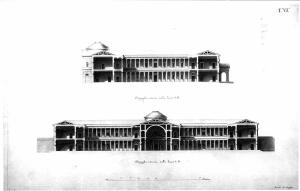 La tavola contiene: sup. la sezione trasversale passante per uno dei cortili. Vista del cortile colonnato con colonne ioniche al p. terreno e loggia in ordine corinzio al piano superiore. Inf. la sezione longitudinale passante in mezzeria dei cortili con vista dei cortili colonnati la sezione della cappella e dei corpi perpendicolari al corpo princ. d'ingresso. Le murature sono campite in acquarello rosa, le capriate lignee in giallo. Le coperture in acquarello azzurro.