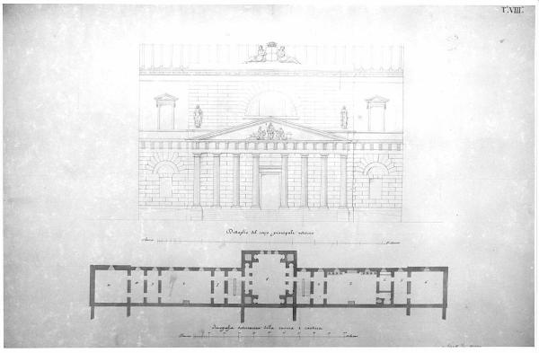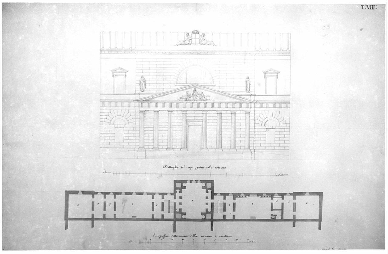 La tavola contiene: sup. il dettaglio del pronao d'ingresso a china, con precisa definizione dei particolari decorativi (gruppi scultorei sulle sommità, statue e bassorilievo sul timpano) e dei particolari architettonici: colonne tuscaniche scanalate e trabeazione dorica con \ntriglifi. Inf. la pianta del piano interrato contenente la cucina e le cantine. Le murature sono campite in acquarello grigio. Sono indicate le vasche dei lavatoi.