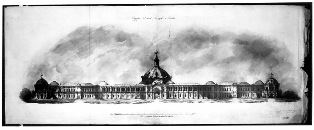 Prospetto ombreggiato di edificio su sfondo sfumato in acqu. grigio e coperture a padiglione e a falde in ferro vetro e colorate in acquarello azzurro. Edificio a 2 p p. con ingresso centrale ad arco e in corrispondenza dell' ingresso corpo di maggior altezza coperto da cupola con aperture ovali negli spicchi. Concludono l'edificio due padiglioni poligonali con copertura a cupola uguale a quella centrale, ma di dimensioni minori.