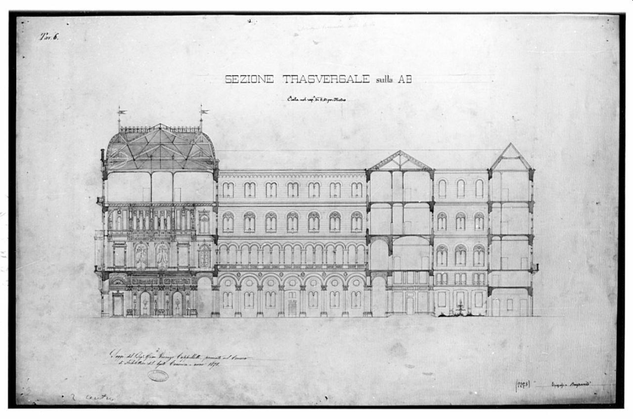 Sezione di edificio a quattro piani con piano terra a doppia altezza. A sin. vista dell'interno dei vani con disegno della decorazione; vista della struttura in ferro e vetro della copertura. Al centro vista della facciata sul cortile con portici al p. t., loggia al piano nobile e bifore ai piani sup. Segue la sezione di un altro corpo, la vista della facciata su un cortiletto con prato e fontana e infine la sezione dell'ultimo corpo.