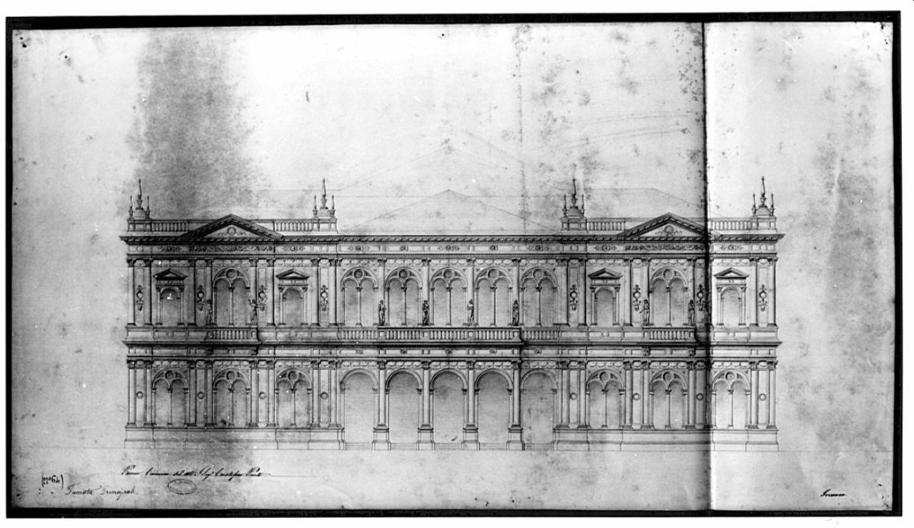 - NOTIZIE STORICO CRITICHE Il disegno fa parte di una serie di tavole conservate nella cartella 15, contenente i saggi premiati al Concorso Canonica. Il progetto fu premiato tra i 6 concorrenti e lodato per la "pianta ordinata" e il "buono stile" (Atti, 1868, pp. 25-26). Cristoforo Pinto, allievo dell'Accademia, ottenne la medaglia d'argento nella Scuola di Architettura nel 1864 ("Atti", 1864, p.47). Nel 1865 e nel 1866 ottenne la menzione onorevole alla scuola Superiore di Architettura. Nel 1867 fu premiato alla scuola superiore di Architettura all'esperimento finale ("Atti", 1866 - 67, p. 57). Nel 1870 vinse il concorso triennale di Architettura, con il progetto di un casino di campagna (TEA G IV 20).