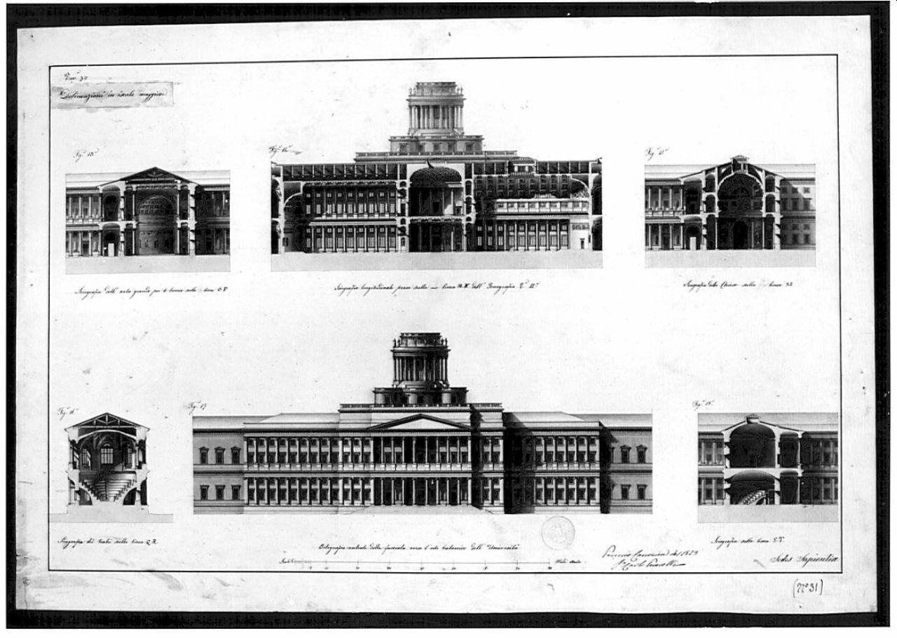 Una università con i suoi grandi compartimenti d'istruzione scientifica e anche con clinica medica e chirurgica. architettura: Università (prospetto e sezione)