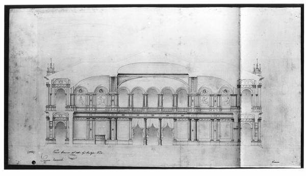 Sezione di edificio a due piani con sala centrale a doppia altezza coperta a volta ribassata. Al pt.3 aperture rettangolari intervallate da\ncolonne, ornate da tende; sup. galleria a 5 arcate.