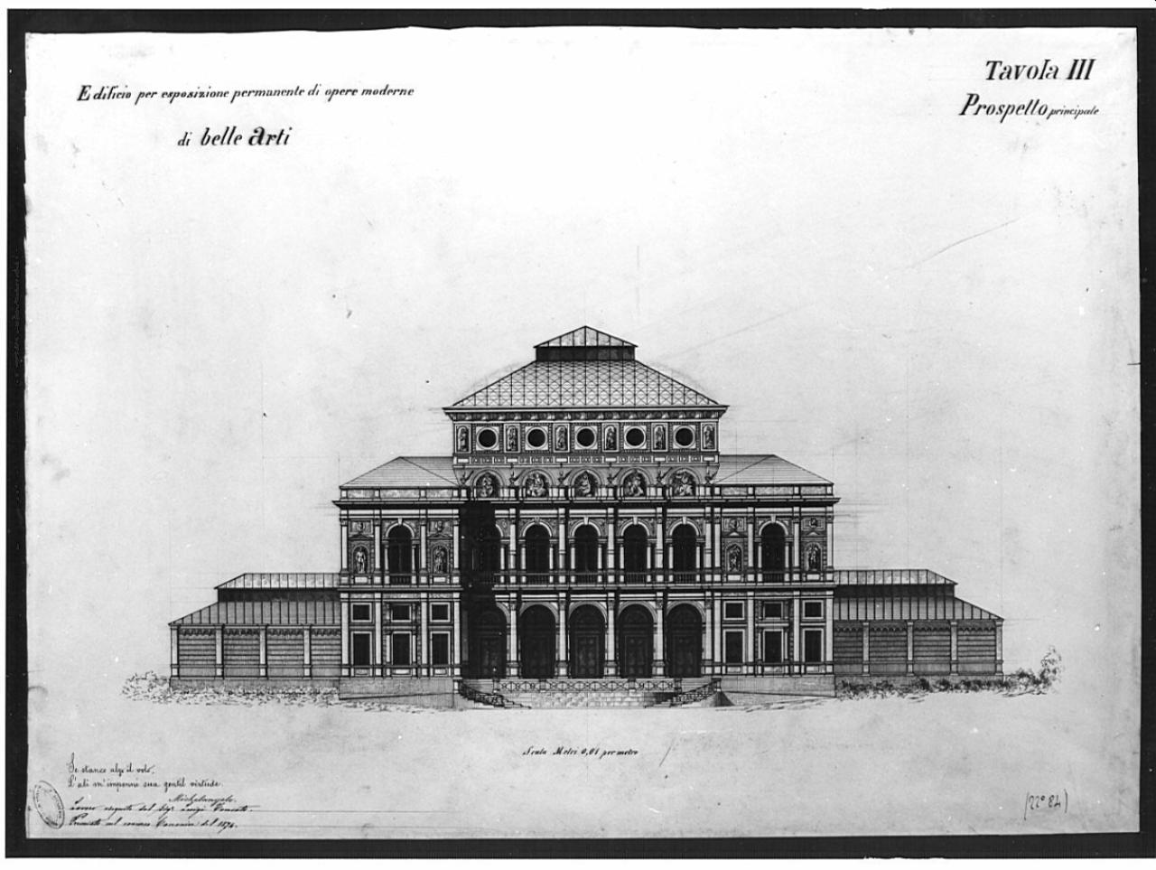 Prospetto di edificio a china, con parti eseguite a tratteggio. Edificio simmetrico con parte centrale di maggiore altezza e corpi laterali digradanti. Portico a 5 archi centrale d' accesso preceduto da scala. Al primo piano loggiato ad archi e sup. attico con finestre ad arco sormontate da oculi; tetto in ferro (disegno delle strutture) sormontato da lucernario.