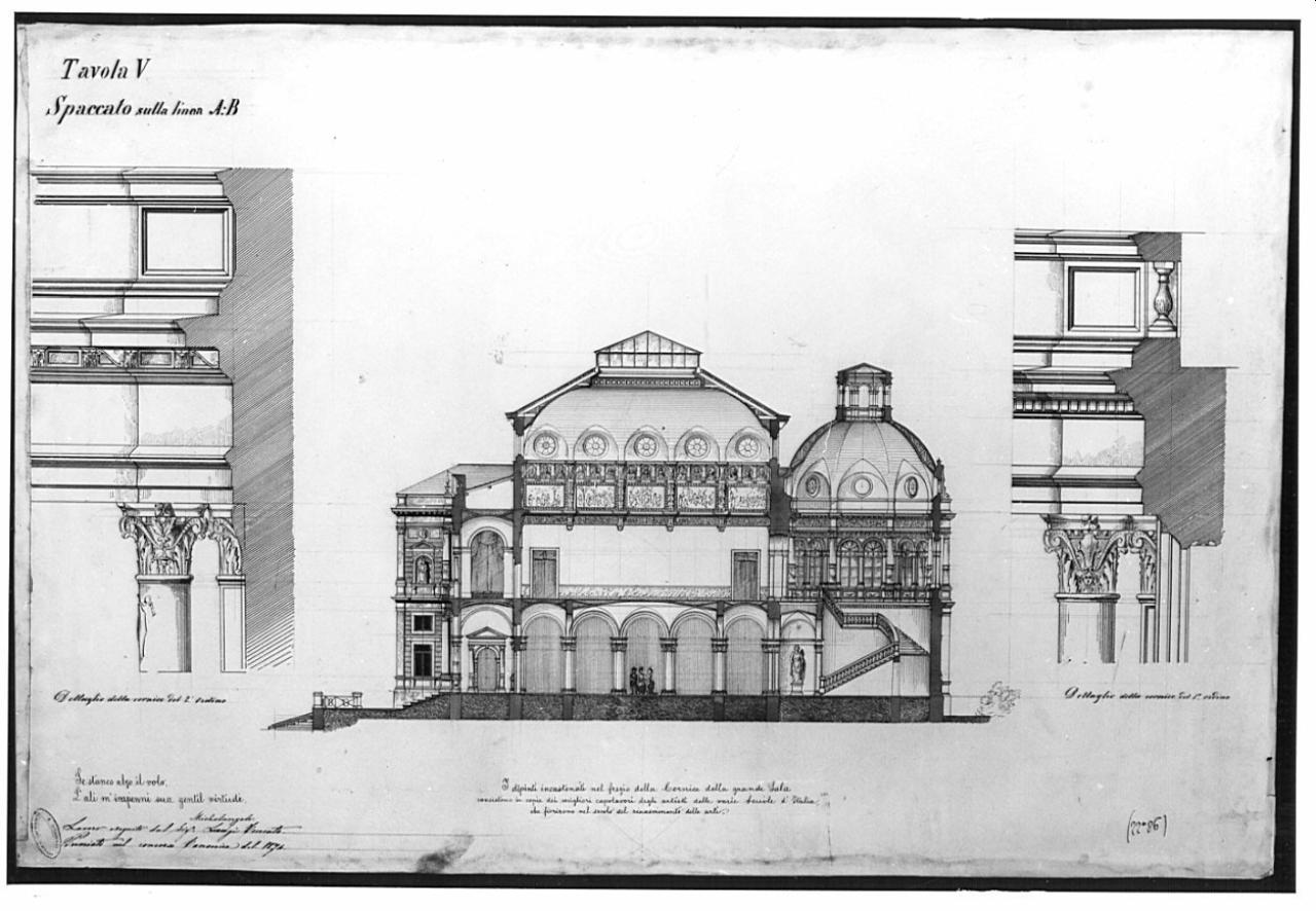 La tavola contiene : al centro la sezione di un edificio con murature acquarellate in rosa, terreno in ocra e struttura del tetto in azzurro. La sezione mostra al pt. un porticato a cinque arcate al centro, una scala di collegamento al piano superiore a ds, il portico d'accesso a sin. A sin. della sezione è rappresentato il particolare di una cornice e di una colonna. A ds un'altro particolare della cornice.