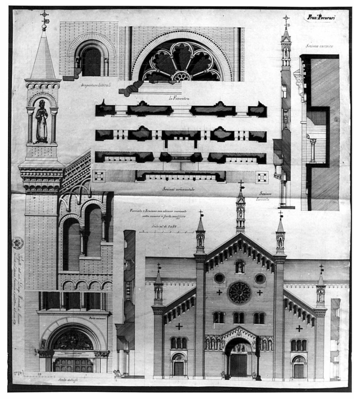 La tavola contiene: prospetti, sez. e dettagli a diverse scale di parti di una chiesa in stile neoromanico, a china con campiture piene (parti sezionate) e a tratteggio orizzontale e verticale con ombreggiature a tratto più fitto. In alto al centro particolare del rosone (metà sup.); al centro sezione orizzontale della facciata (diversi piani). A destra in alto sezione della cornice; a sin. part. del portale secondario (inf.); particolare della parte terminale della facciata con torretta con statua. A ds. facciata intera della chiesa.