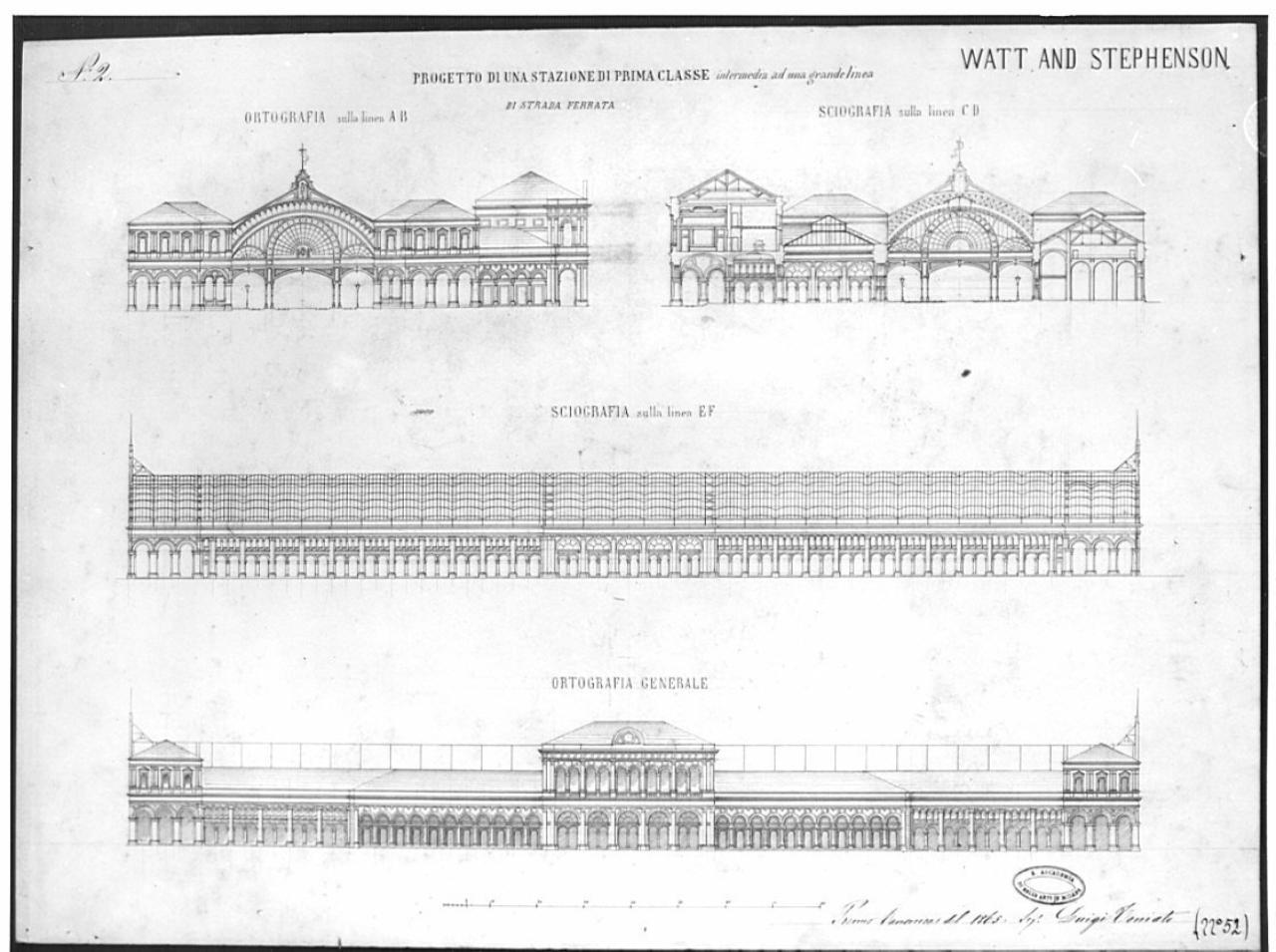 - NOTIZIE STORICO CRITICHE Il disegno appartiene ad una serie di 12 tavole, presentate dall'ex-allievo dell'Accademia, Luigi Toniato, al Concorso Canonica del 1865. Unico partecipante al Concorso, Toniato venne premiato nonostante la "pianta contorta" e l'assenza di riferimenti a stazioni già costruite". (Giudizi in "Atti", 1966, pp.33 - 35). Toniato vinse anche il concorso del 1874 e quello del 1878. Le tavole seno conservate nella cartella n°15, contenenti i progetti preniati al Concorso Canonica (Gabinetto dei disegni dell' Accademia presso la Biblioteca dell' Accademia).