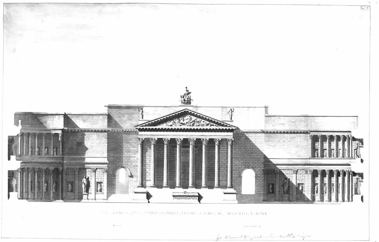 Sezione trasversale del Foro, con prospetto del tempio di Marte e sezione degli degli emicicli laterali. Disegno a simmetria assiale verticale; colorato a bistro grigio. Le murature in sezione hanno campitura rosata, le statue azzurra. Al centro: tempio octastilo con colonne scanalate dal capitello corinzio, sormontate da trabeazione con fregio liscio e timpano effigiato coronato da gruppo scultoreo. Ai lati, nella muraglia del Foro, archi di ingresso e parete liscia ornata da un ordine di paraste con capitello e trabeazione corinzie. Il motivo stilistico prosegue nel colonnato a 2 pp. delle adiacenti esedre.