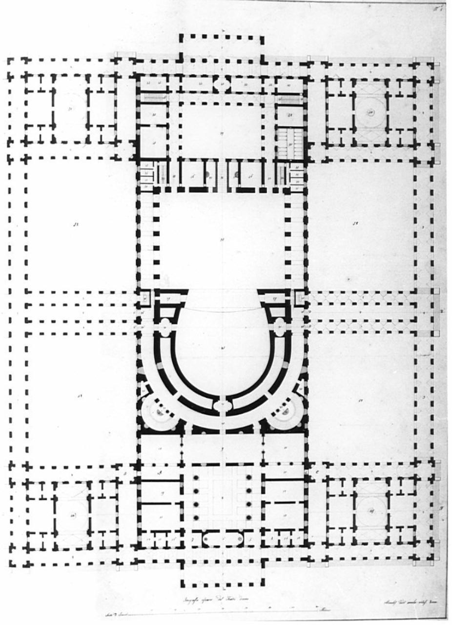 Pianta di teatro a ferro di cavallo con quattro cortili e doppio ingresso porticato. I diversi ambienti sono contrassegnati ad numeri di riferimento e da una legenda che si è conservata con il disegno. Sui lati maggiori, al centro, sono posti altri due piccoli ingressi porticati e preceduti da gradinata che, attraverso una galleria permettono l'accesso alla sala.