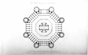 Pianta ottagonale con 8 torri circolari poste sugli angoli. Al centro, compreso all'interno di un canale circolare, un edificio ottagonale con grande sala rettangolare. Esternamente vista della piantumazione e di un percorso circolare.