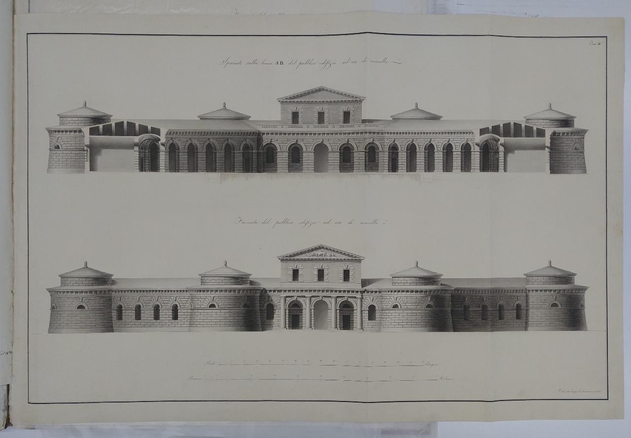 Prospetto della facciata principale. L'edificio, in bugnato, ha un portico d'ingresso costituito da tre aperture ad arco separate da 4 colonne di ordine tuscanico. Il piano superiore del corpo centrale è composto da tre aperture con frontone timpanato. Vista di 4 delle torrette angolari con copertura. La sezione AB presenta con campiture in acquerello rosa le parti sezionate. Vista della facciata interna.