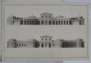 Pubblico edificio ad uso di macello in un'area non maggiore di 120000 piedi parigini. architettura: Macello Bovino (sezione e prospetto)