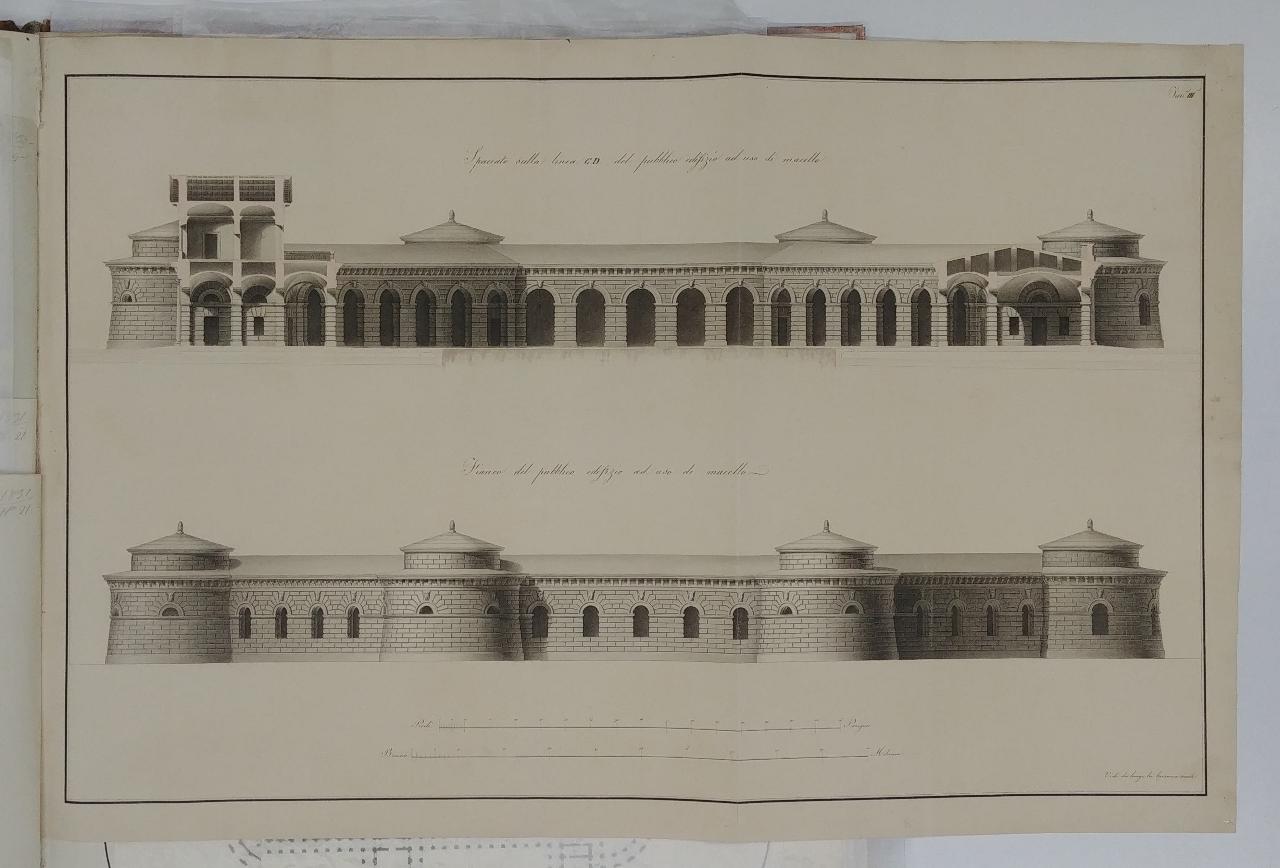 Pubblico edificio ad uso di macello in un'area non maggiore di 120000 piedi parigini. architettura: Macello Bovino (fianco, sezione)