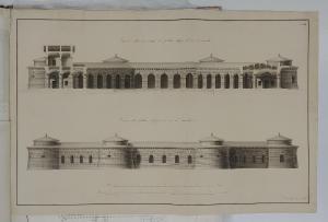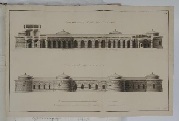Facciata laterale in bugnato Vista di 4 delle torrette circolari con finestre a lunetta. Spaccato lungo la linea CD. Vista del fronte porticato interno. La sezione mostra i canali di scarico delle acque.