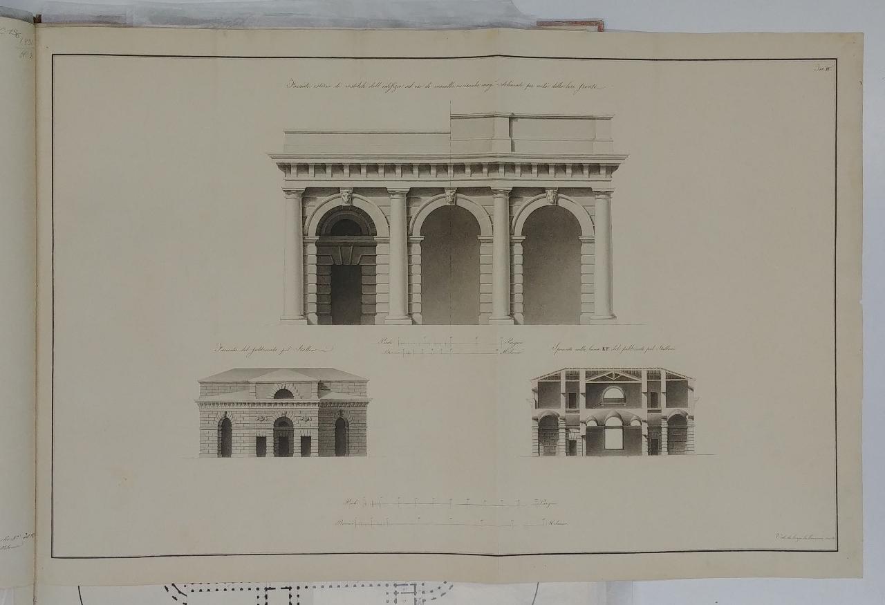 Pubblico edificio ad uso di macello in un'area non maggiore di 120000 piedi parigini. architettura: Macello Bovino (particolare del portico d'ingresso, sezione della stalla)