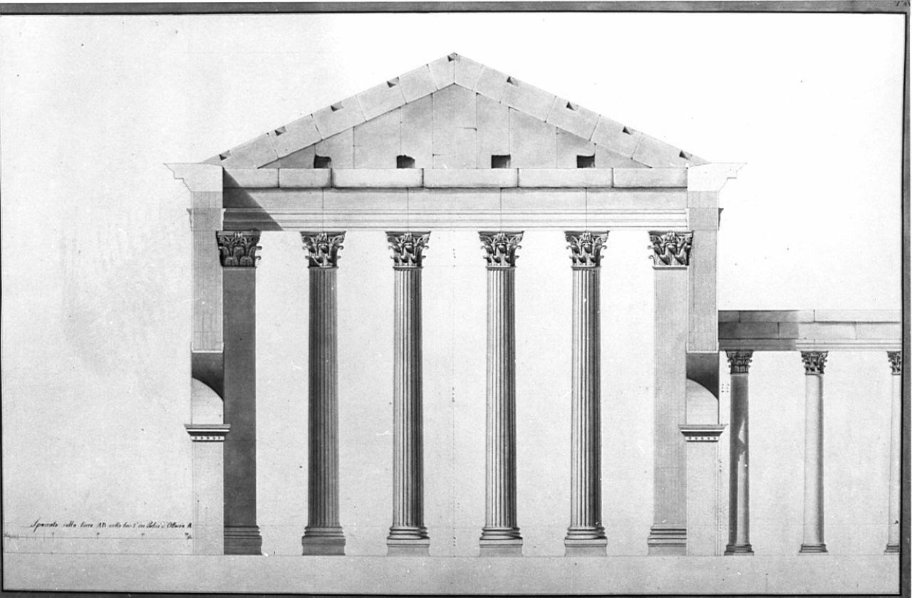 Sezione interna sulla linea AB dei Portici di Ottavia, compresa entro margine grigio scuro, e colorato in bistro. Al centro: sezionate trasversalmente, le due pareti (nella sez. sup. colorate di rosa) con arcate inf., comprendono 4 colonne scanalate e 2 pilastri compositi. Questi reggono architrave liscio con cornicette inferiori, sormontate da timpano triangolare a conci rettangolari. A destra: serie di tre colonne composite lisce, reggenti architrave (inf. a cornicette, sup. a conci).