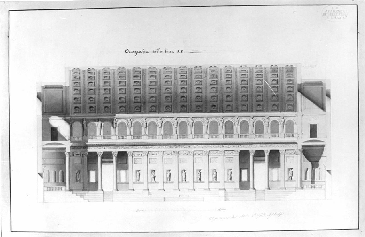Sezione longitudinale di sala con cavea a gradoni, a china, e bistro con ombraggiure più scure e murature sez. in acquarello rosa entro linea di margine e bordo in acquarello grigio a cop. piana. Inf. cavea a gradinate circondata da galleria: al centro muratura campita in intervalli regolari da lesene corinzie. Tra le lesene nicchie ad arco e rett. alternate con statue; a ds e a sin porta rett. di ingresso alla sala diaframmati da coppia di colonne; sup. loggia ad archi con balaustra; copertura a volta a botte cassettonata.