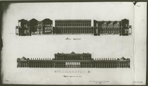 Prospetto e sezione di edificio a china, bistro e acquerello rosa, beige e azzurro su fondo chiaro.\nInf.: Prospetto di Casino per Filodrammatica con vista del corpo centrale e ingresso colonnato chiuso da cancelli in ferro battuto.\nSuperiorm.: Finestratura delimitata da pronai con frontone scolpito. Corpo di fabbrica coperto da cupole ribassate sugli angoli e cornice con balaustra e statue. Sup.: Sezione longitudinale con vista del prospetto della corte centrale, della sala teatrale e della grande sala rettangolare con aperture.