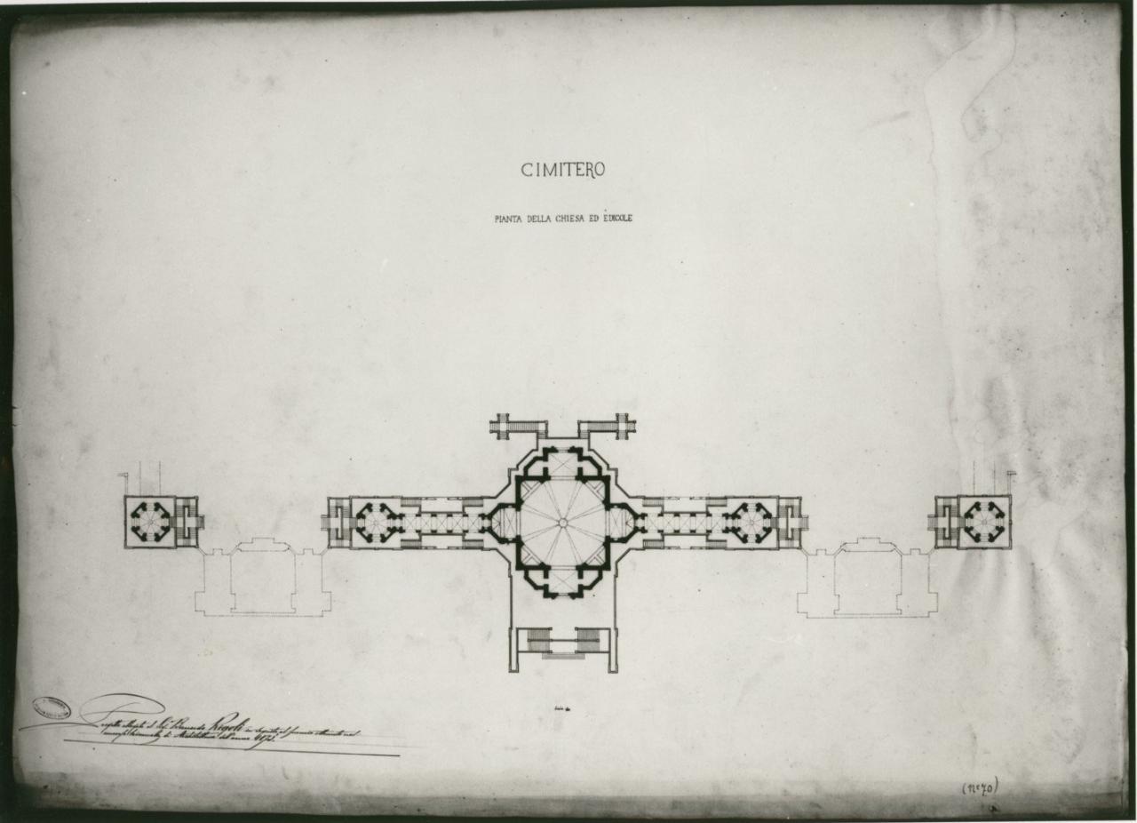 Cimitero per un città di 14000 abitanti, con chiesa, portici, edicole, cappelle ed i relativi locali di servizio. architettura: cimitero (pianta)