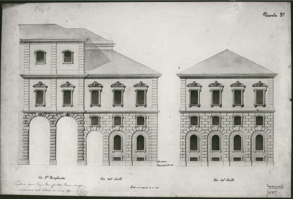 Cartoncino colore beige. La tavola contiene 2 prospetti di edificio a matita e acquerello. A sinistra prospetto della parte terminale di edificio con al piano terra muratura in pietra, due arcate a doppia altezza e serie di 3 archi uno passante e gli altri due con finestre. Superiormente finestre ad arco ribassato del mezzanino. \nAl piano superiore serie di 5 finestre rettangolari sormontate da lunette. Superiormente nella parte a sinistra due finestre ad arco ribassato. Tetto a falde. \nA destra prospetto laterale di edificio a due piani con piano mezzanino. Al piano terra serie di quattro arcate racchiudono quattro finestre ad arco e quattro aperture rettangolari a livello del seminterrato. Superiormente quattro finestre del mezzanino. Al primo piano quattro finestre rettangolari sormontate da lunetta. Copertura a falde.