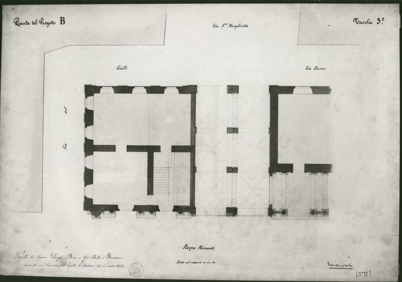 Completamento del Palazzo di Piazza Mercanti, detto de' Giureconsulti, in relazione all'apertura della nuova via di giunzione tra la detta piazza de' Mercanti ed il Cordusio.... architettura: palazzo di Piazza dei Mercanti di Milano (pianta)