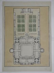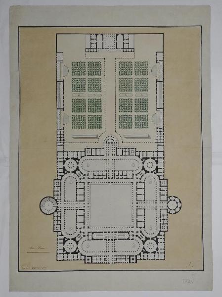 Progetto di palazzo reale a china, bistro e acquerello giallo e verde con tracce di matita. Linee di sezione a china rossa su fondo giallo entro doppia linea di margine a china e bordo chiaro. Pianta quadrangolare simmetrica con giardino retrostante, con due corpi circolari a destra e sinistra al centro a due livelli diversi con serie di vani e cortili quadrangolari ed elittici.