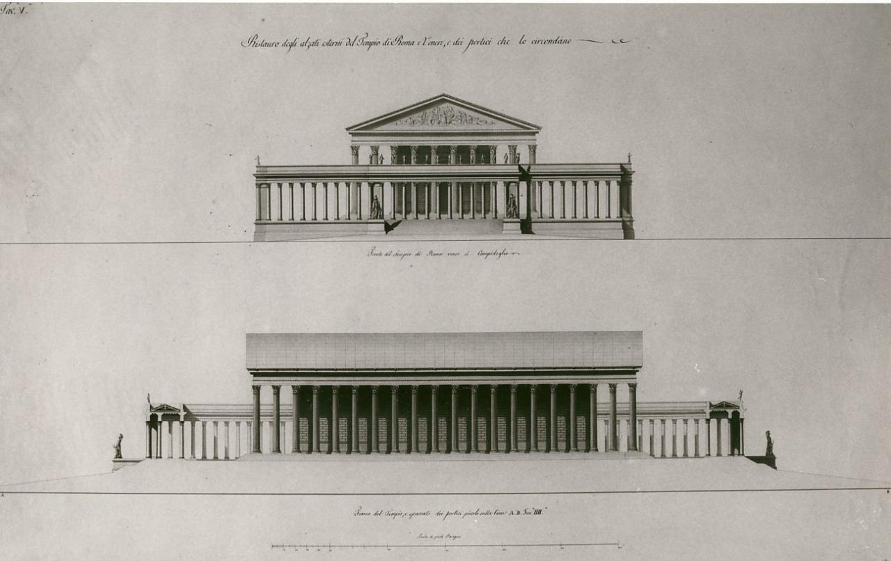 Prospetto e sezione del Tempio di Roma e Venere, a china, bistro e acquerello rosato, su sfondo chiaro, entro linea di margine a china. Inf.: alzato del fianco del colonnato interno con visione del muro della cella e della falda del tetto; sezione longitudinale del porticato esterno lungo la linea A.B,T IIII. Sup.: prospetto della facciata del tempio con veduta del porticato esetrno architravato che lo circonda e del tempio interno con timpano inciso.